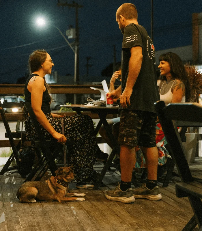 Jantar e socialização. Treino com ambientação e orientação sobre como conduzir o animal em ambientes públicos, evitar cães soltos, corrigir reatividade, etc. Custos e contas em bares e restaurantes, cada um paga o seu!